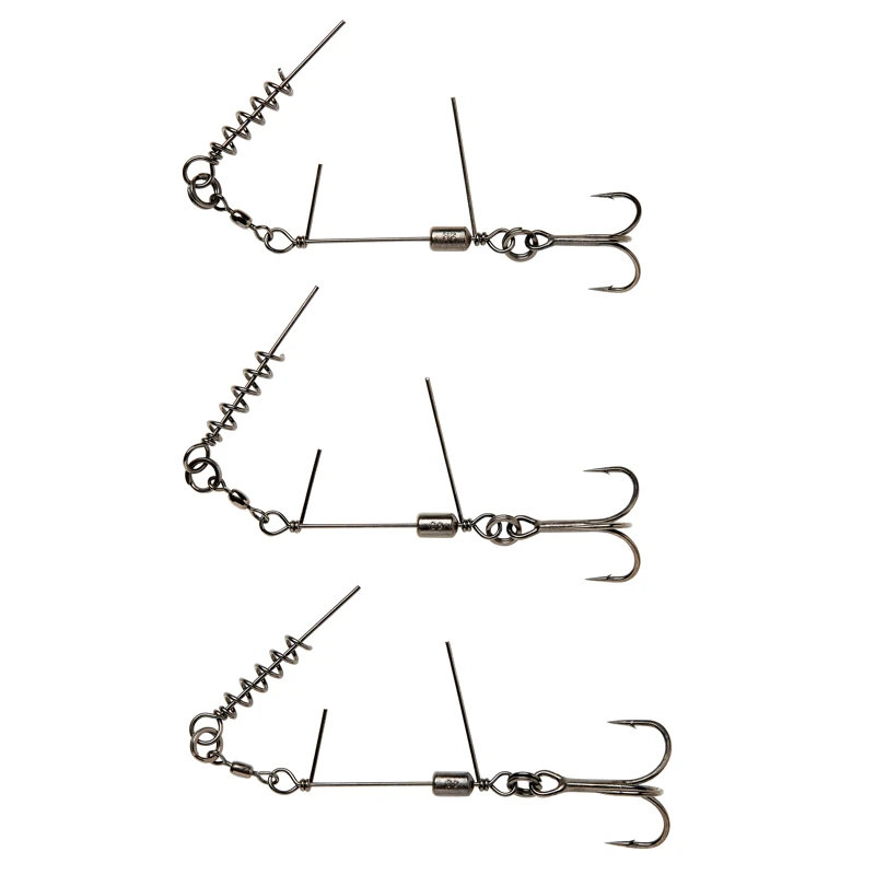 Pointes droites, pour un maintien et un relâchement parfaits. Poids ventral en alliage de 3 g, pour un équilibre parfait avec nos gros shads, comme River Roach, Goby shads, Herring shads, etc.• Fil en acier inoxydable • 2 pièces/paquet, avec finition BN et Hameçons rouges
